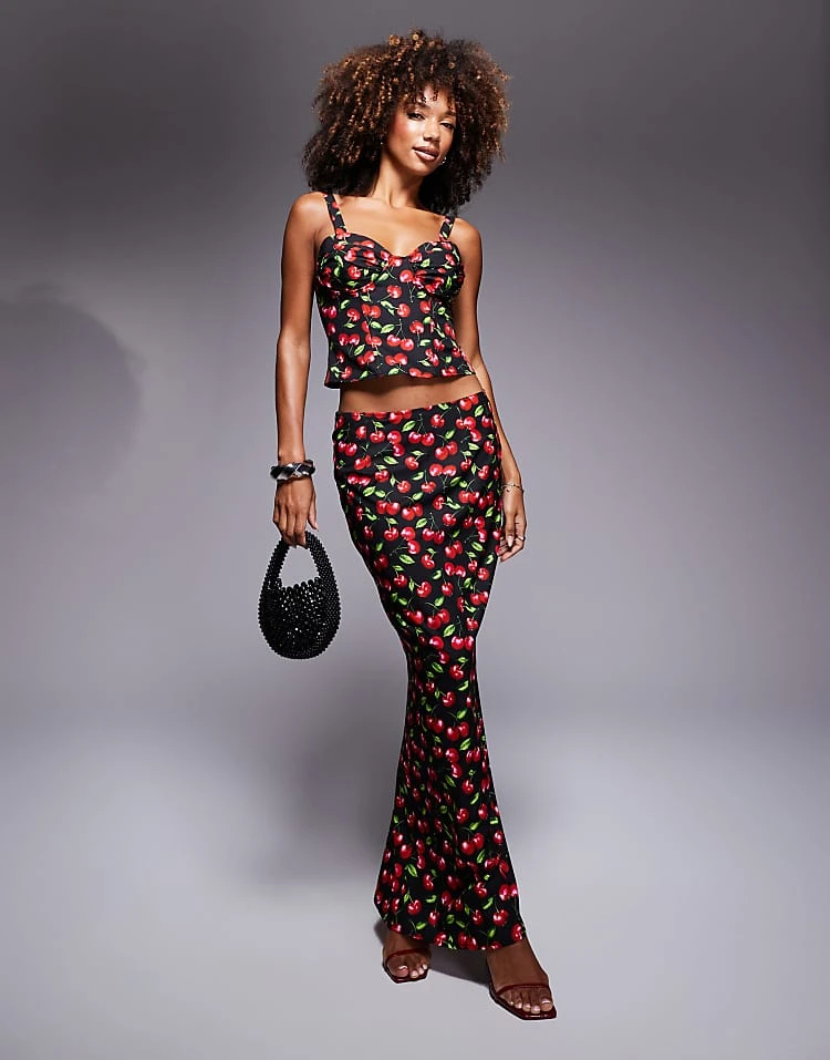 Missyempire Bustier Top And Low Rise Maxi Skirt Co-ord In Cherry Print